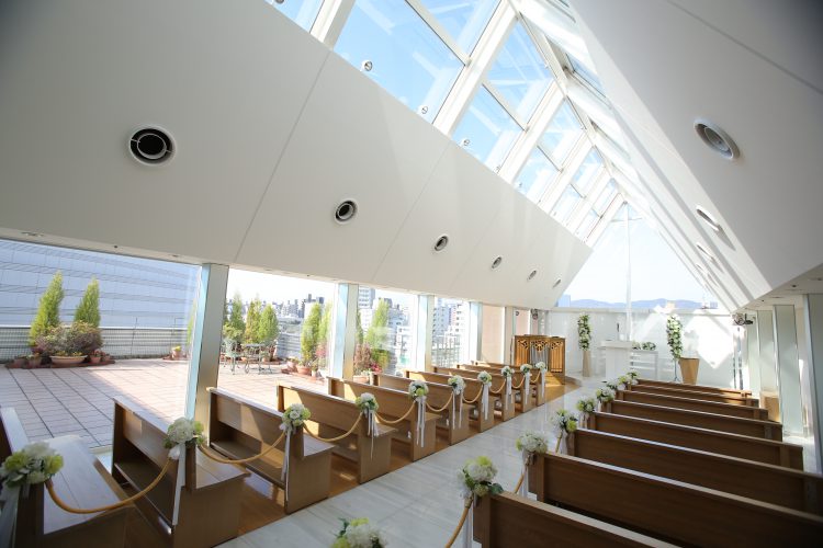 天井から自然光が降り注ぐ、開放的なチャペル。チャペル横のテラスからもたっぷりの陽が入ります。
